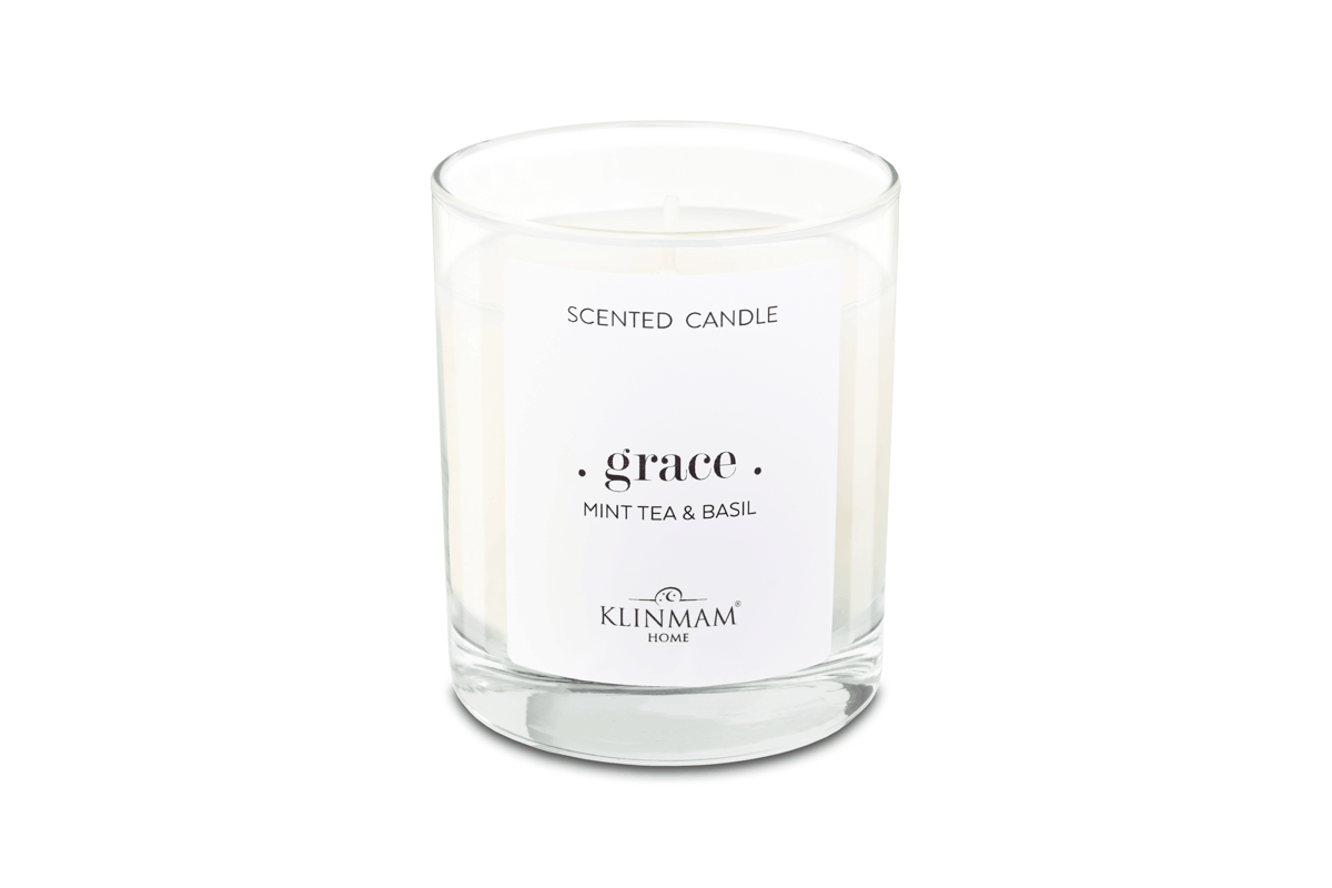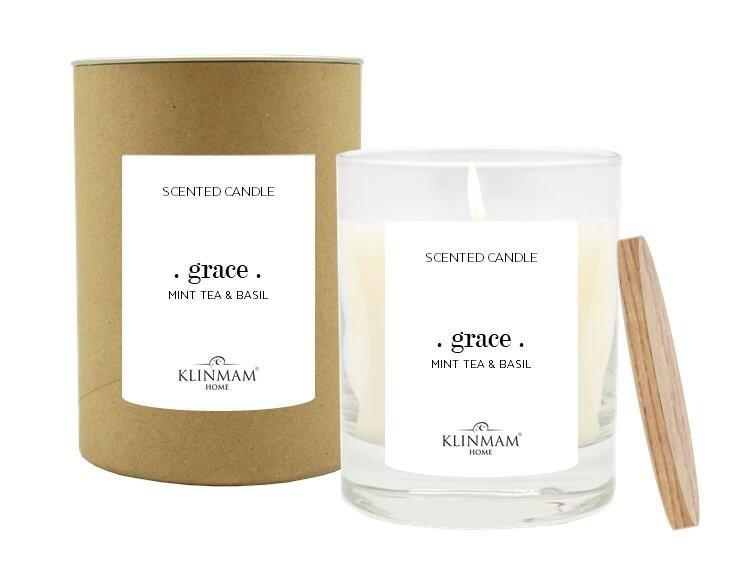 Fényűző Klinmam Home Mint and Basil illatgyertya természetes alapanyagokból a friss menta és a bazsalikom illatával