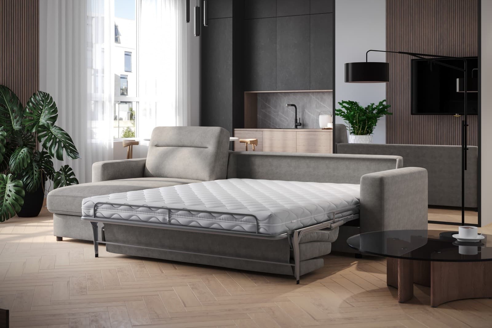 A kanapé alapfelszereltségként 16 cm magas, deformációálló HR hab matraccal rendelkezik. A kanapé új, fejlett mechanizmussal van ellátva, amely lehetővé teszi, hogy könnyedén alakítsa át kanapéját nagyon kényelmes fekhellyé. Az esti kihúzás és a reggeli összecsukás kezelése rendkívül egyszerű és könnyű. Kihúzás után egy kényelmes ágyat kapunk 16 cm magas matraccal, 140x190 cm méretben.
